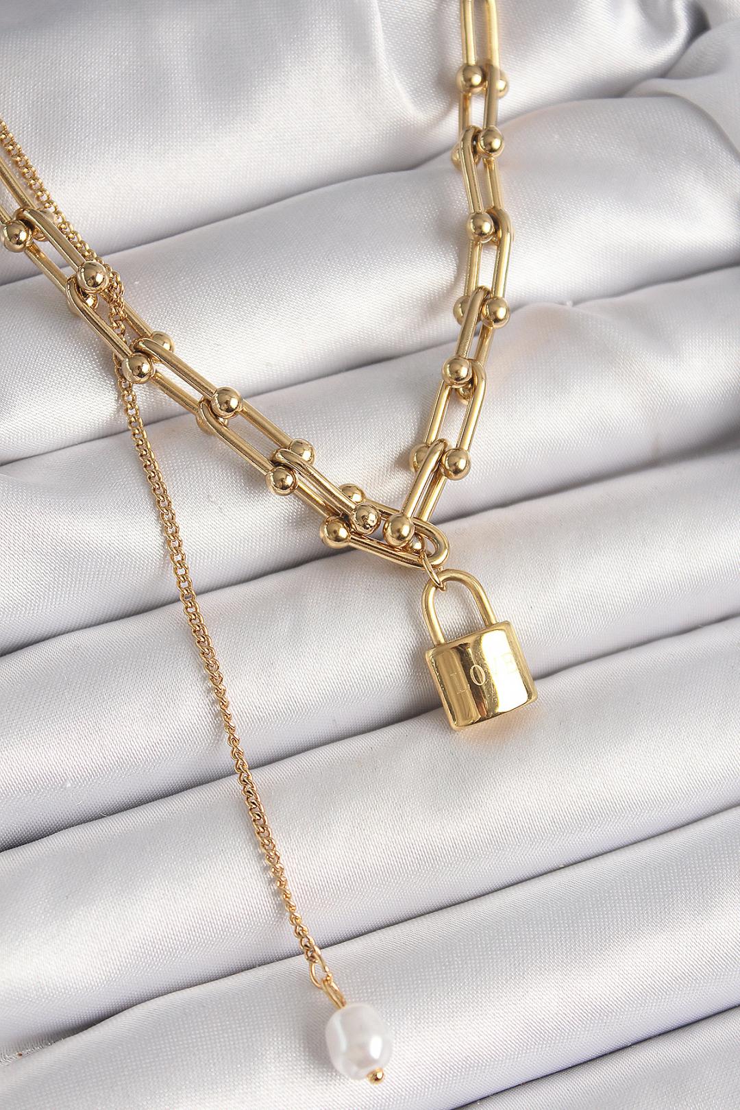 316L Çelik Gold Renk Tifany Zincir Model Kilit Figür Sallantı İnci Detay Kadın Kolye